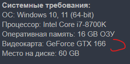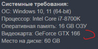Системные требования: ОС: Windows 10, 11 (64-bit) Процессор: Intel Core i7-8700K Оперативная память: 16 GB ОЗУ Видеокарта: GeForce GTX 166 Место на диске: 60 GB