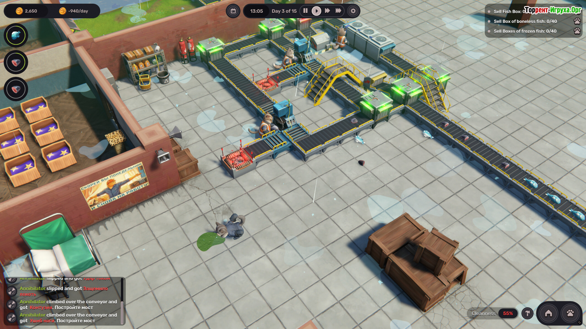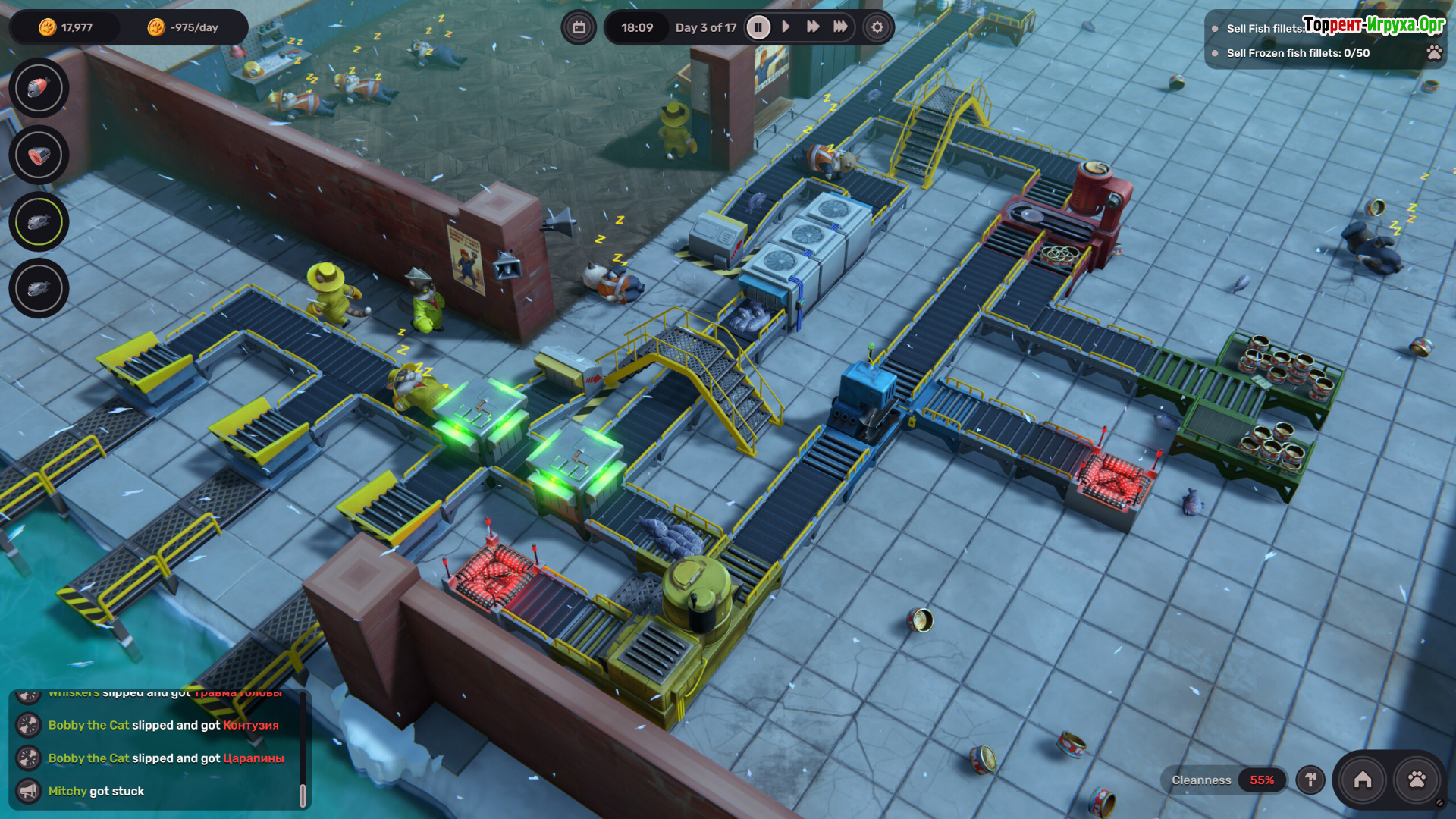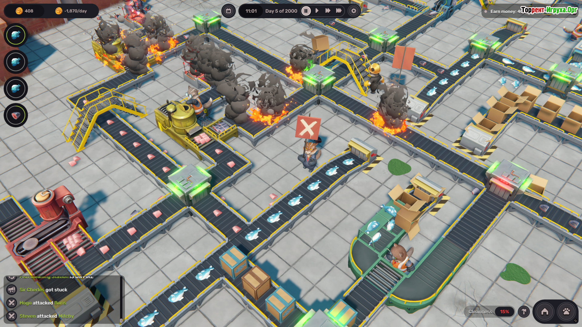 Полный цикл — от сырья до готового товара — требует точной балансировки ресурсов. Одновременно приходится контролировать зарплаты, условия труда и настроение коллектива. Недовольные работники не ограничиваются жалобами: они ломают механизмы, устраивают диверсии и превращают аккуратный завод в зону постоянных происшествий.