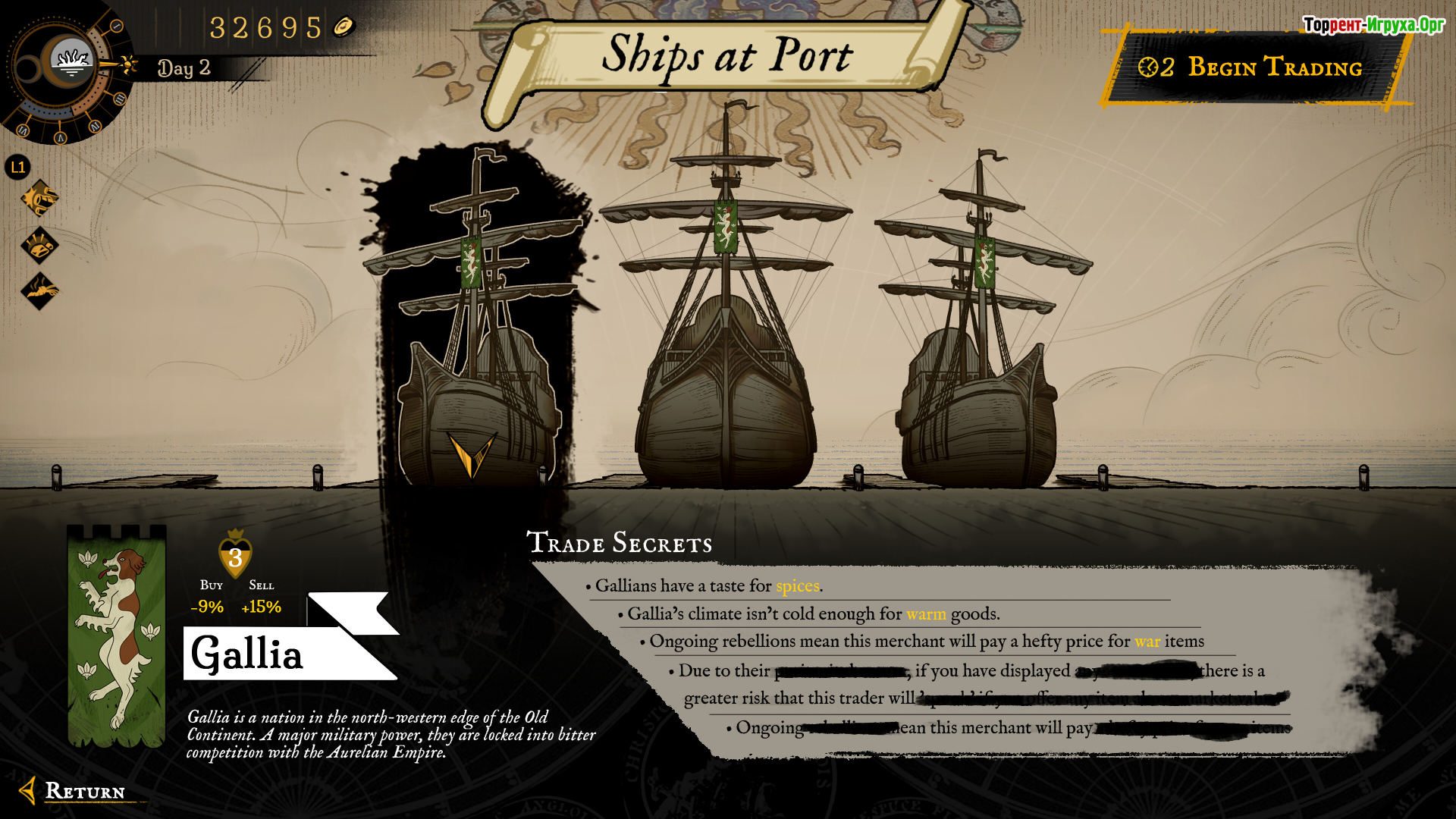 Днём вы управляете торговлей, модернизируете предприятия и допрашиваете жителей, каждый из которых скрывает собственные тайны. Переговоры с купцами, контроль экономики и выбор линии поведения формируют политический баланс внутри колонии. Любая ошибка может привести к упадку или усилить чужое влияние.