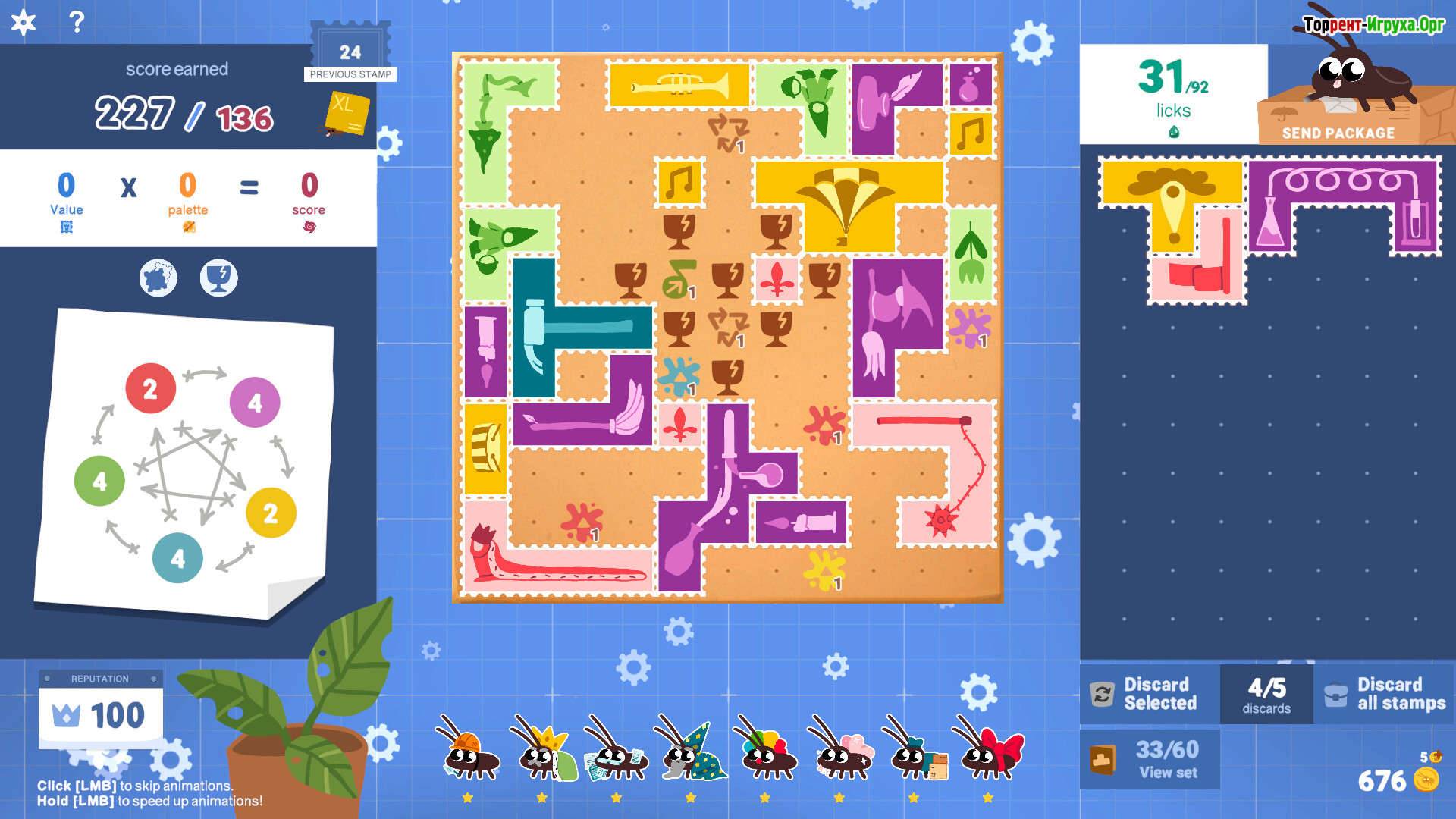 Марки выполнены в формате полимино и требуют точного размещения на упаковке. Цвета взаимодействуют между собой, создавая синергии или конфликты, влияющие на итоговый результат. Клиенты приходят с разными заказами и таймерами, поэтому решения приходится принимать быстро, сохраняя баланс между скоростью и аккуратностью.