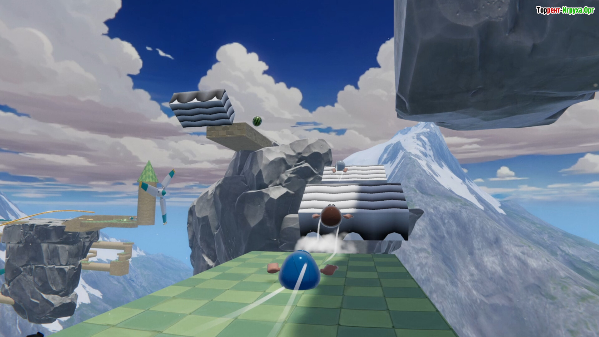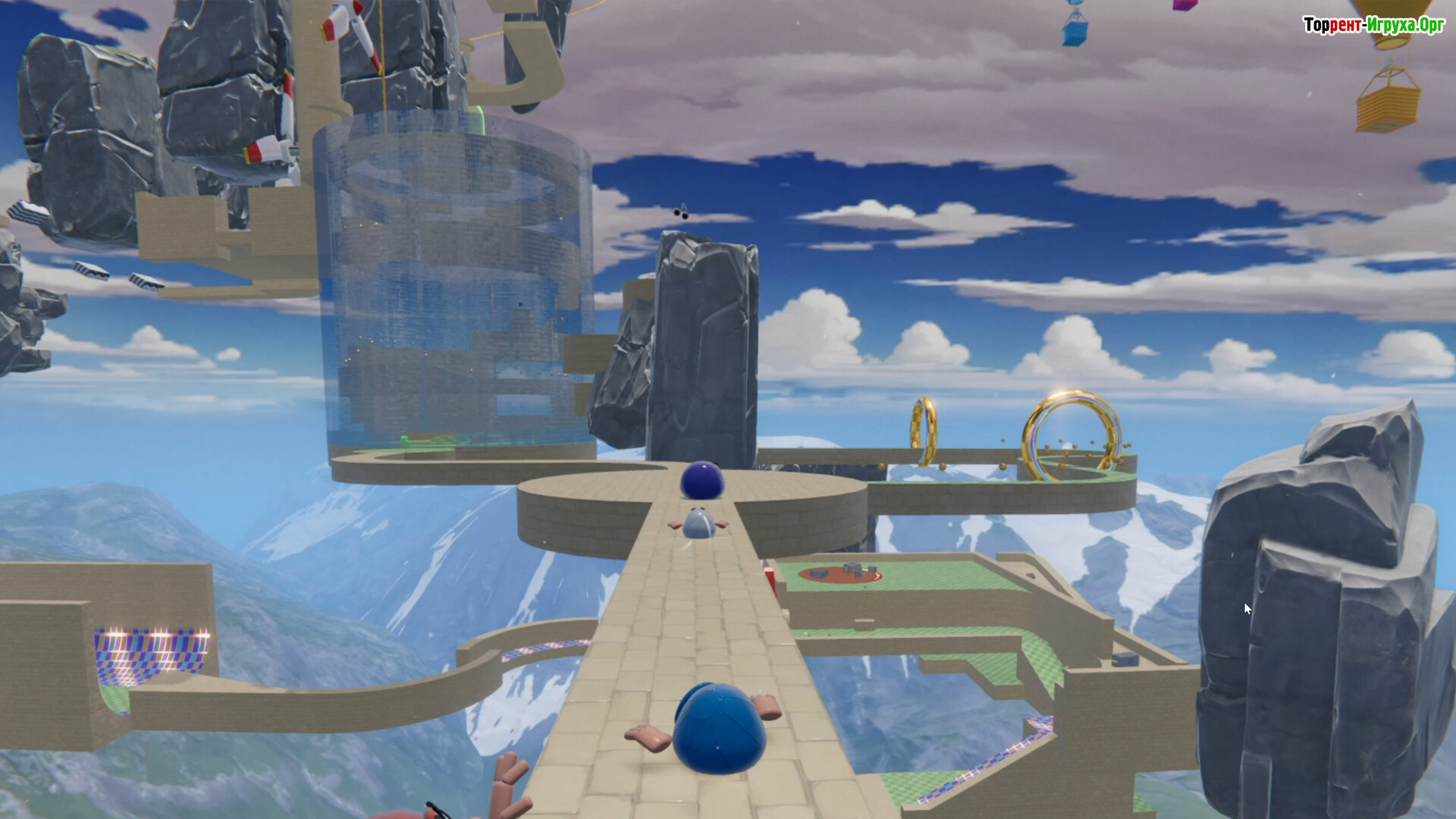 Передвижение строится на импульсе и взаимодействии. Нужно разгоняться, цепляться за союзников, выстраиваться башней или удерживать равновесие всей толпой на шаткой платформе. Некоторые задачи нарочно выглядят абсурдно — управлять объектом, которому не требуется восемь рулевых, или прыгать в пустоту, надеясь, что кто-то успеет подхватить.
