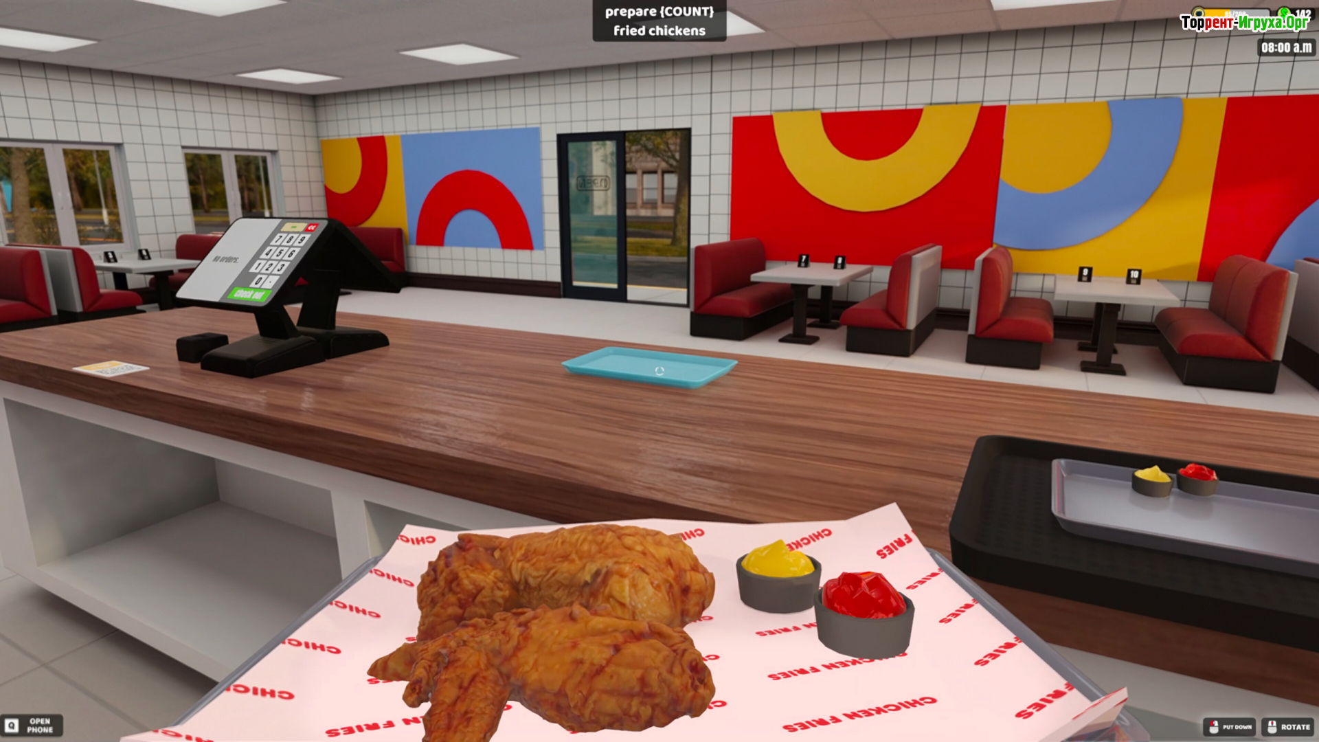 Рабочее место — оживлённый прилавок, где каждая деталь важна. Нужно панировать кусочки, опускать корзины во фритюр, собирать картофель фри и формировать заказы, пока запасы ингредиентов стремительно уменьшаются. От точности действий зависит настроение посетителей и прибыль заведения.