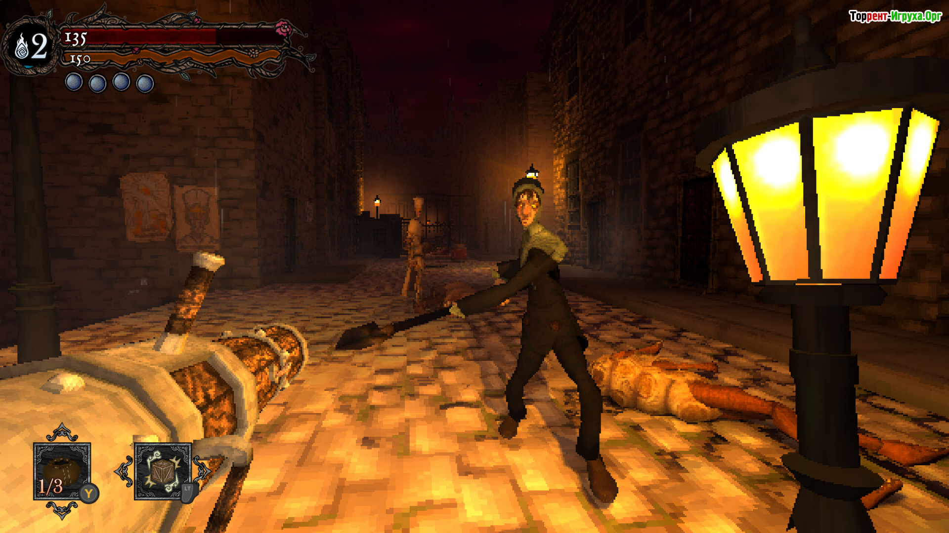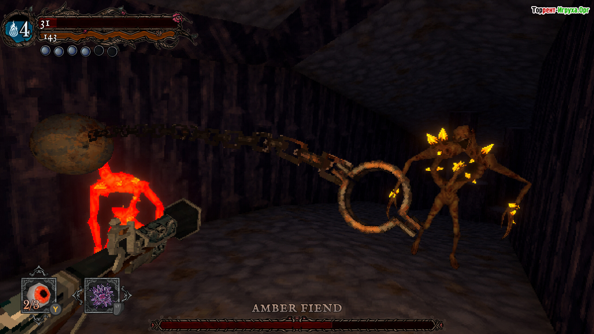 Арсенал разнообразен и даёт свободу подхода. Мечи, кнуты, огнестрел и мистические артефакты обладают собственными характеристиками, влияющими на стиль боя. Магия усиливает удары и позволяет справляться с внушающими трепет противниками, а визуальный стиль ретро-модерн подчёркивает гнетущую атмосферу подземного мира.