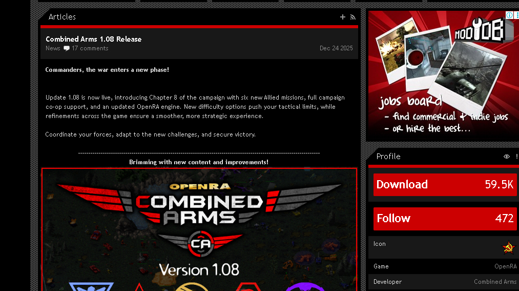 Vetini, кстати если уже поделился игрой, я тоже поделюсь) рился я на сайте modDB, нашел очень крутую модификацию на OpenRA, називаеться command-conquer-combined-arms, эта модификация в 1000 раз лучше самой игры, там короче ооочень много команд, ооочень много танков людей и прочего , и карт там 610 штук, у меня глаза на лоб повилазили, ну миссий там не так и много но тоже нормально по количеству, не играл еще, может те миссии длинние и каждая из них сложная и уникальная графика бомба, есть там и карты с обычной OpenRA, но там остальние все модифицирование, и добавило общество, закачал в шоке, прохожу сейчас, поки изучаю, реально очень много всего, боты там тоже довольно умные, их там больше, да игра долго грузиться, менюшка когда запускаешь, но не удевительно, долго очень рассказивать, скачай она того стоит)) она в 1000 раз круче оригинала, этот мод самий популярный на эту игру, ии если что отдельно скачиваешь, реально мне понравилось, изучать и изучать в этой игре.... Энтузиасты очень постарались респект им! Реальна игра очень крутая вышла. Только скачал буду играть, но уже сразу залетела.