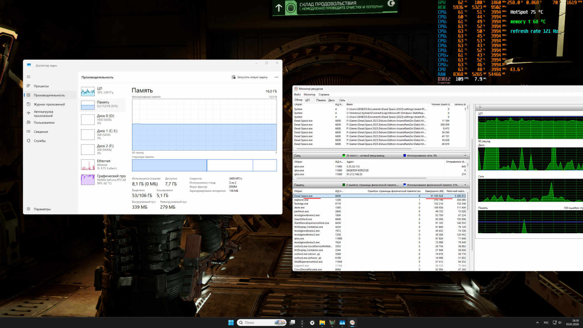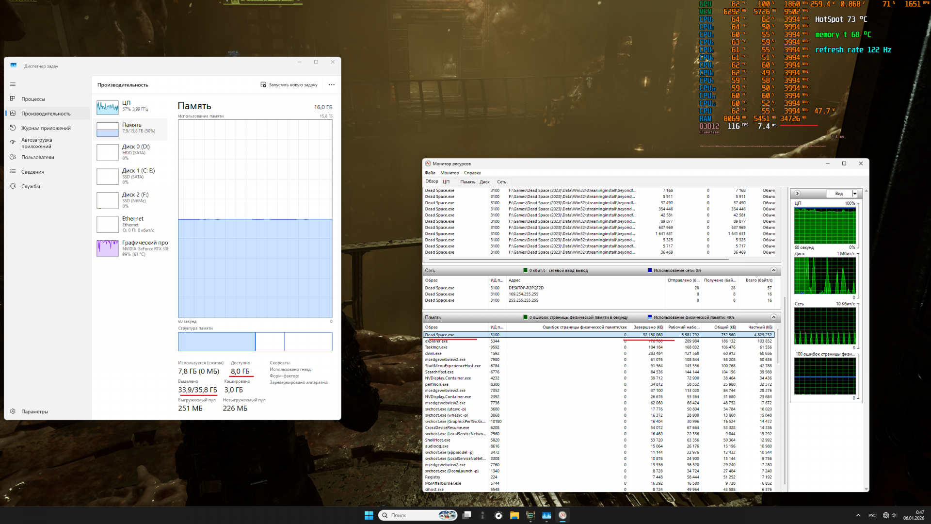 Кряк пока недоделан. Ставьте 150ГБ в файл подкачки и это сработает до того момента в игре, где она за 300Гб может улетать. Это утечка памяти из-за взлома игры. Но это не значит, что игра пишет вам на диск по 120Гб в файл подкачки, ничего она не пишет на диск, это просто ошибка выделения памяти из-за её утечки, которую показывает монитор мси афтербёрнер.