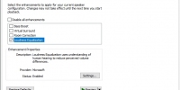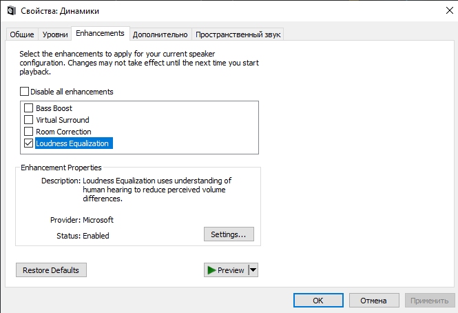 Нажмите правой кнопкой мыши на значке звука, который расположен на панели задач, выберите "Микшер громкости", в открывшемся окне нажмите на устройство, через которое у вас звук идёт, у вас откроется окно со свойствами этого устройства, откройте там вкладку "Enhancements", и поставьте там вот такую галочку, как на скриншоте показано, потом нажмите "Применить" - "ОК", и игру запустите