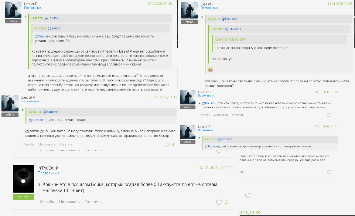 И самое главное они начали очернять и меня как я и думал и писал вам. они начали обзывать меня каким та бБокай и что у миня 50 акаунтав. @Lies of P и @inTheDark теперь напали на меня как я иговорил, за то что я заступился за vitini