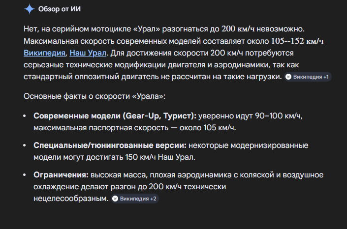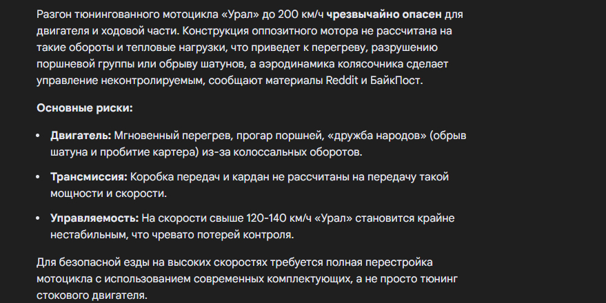Пхах поверил пожилому человеку у которого деменция и он бред постоянно несет ржу не могу XD, он в таком состоянии все что угодно может сказать, даже что он на копеечке смог до 300 километров разогнаться какой бред :rolling_on_the_floor_laughing: Это не возможно на обычном урале никак, это нужно двигатель, все менять полностью на новые запчасти, тюнинговать по полной програме тратить кучу денег, чтобы выжить из него больше скорости, темболее даже в видео нету такого, чтобы кто-то пытался урал до 200 км разогнать, поетаму дед шизик и это понятно, ведь я сразу изучил урал когда он мне это сказал, и ни как увы, и это тоже конечно же был эго бред от деменции. Двигатель предназначен до 90 километров в час максиум, ну а прокаченый если хорошо прокачать також и быть только до 160 км/ч. Сейчас делают уже современые модели урала которые могут разогнаться до 150 километров в час, но мы говорим еще про эго время, в тех временах модели были старые, и врятли даже тюнинг мог разогнаться до 200 километров в час, может сейчас и возможно, но а в тех временах врятли.