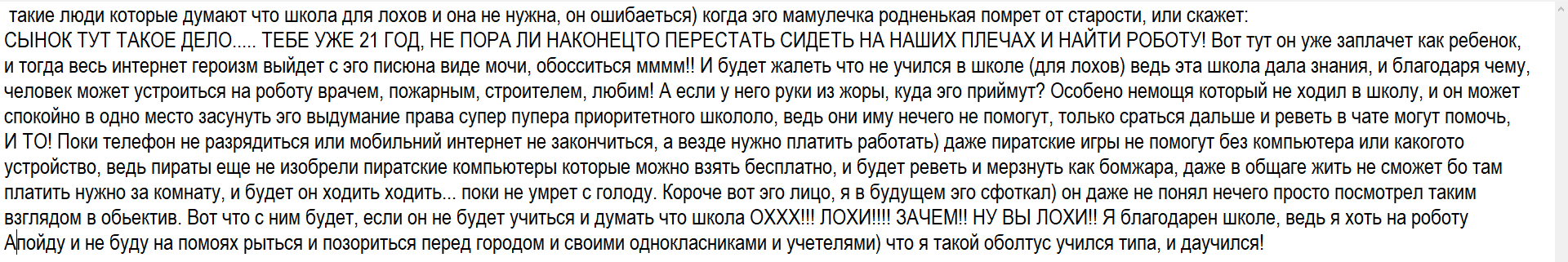 Так я не воспринимаю, зачем мне? Мне всеравно, чисто посмеяться над такими или посмотреть как они любят поносить в чате, смешно же) почитать, посмеяться над такими. Та и время провести.