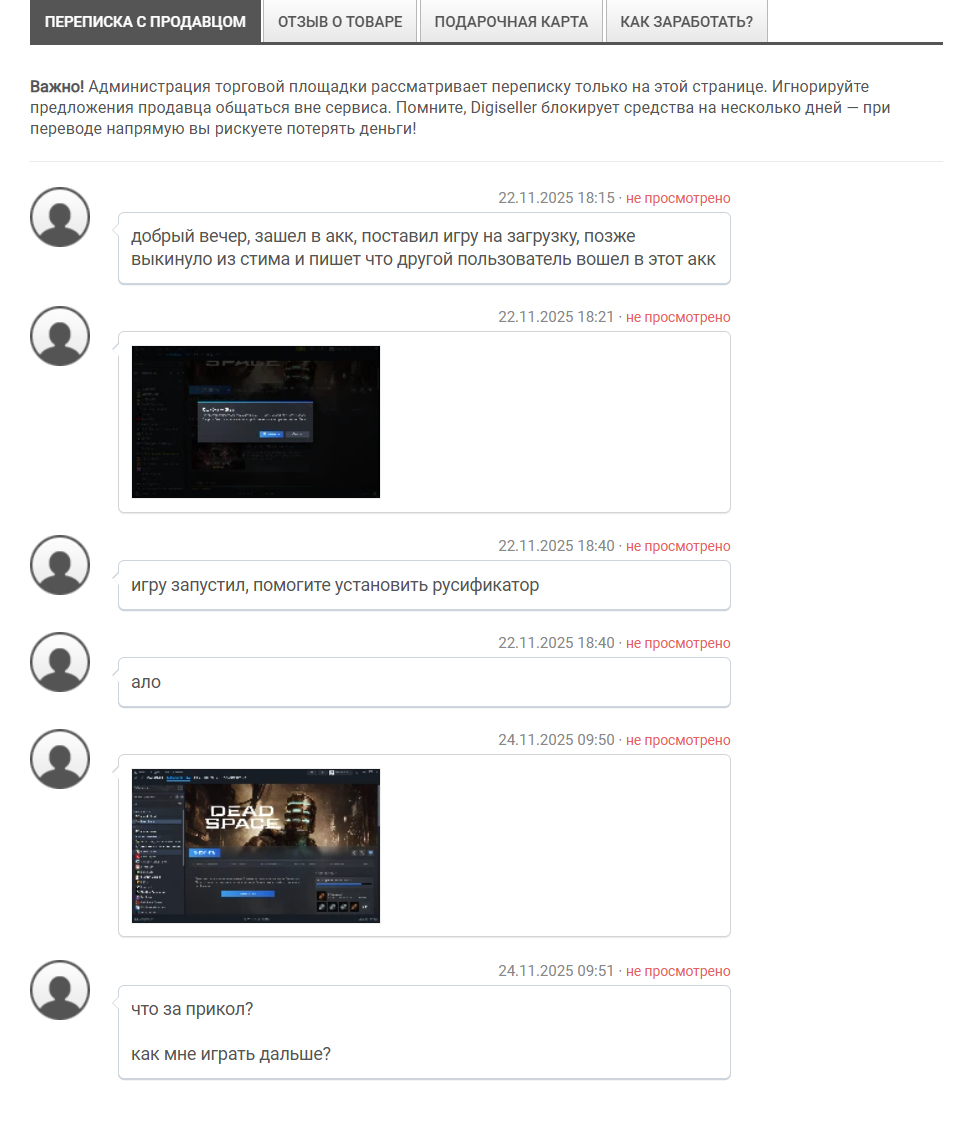 а кому писать если меня кинули с игрой? продавец не отвечает